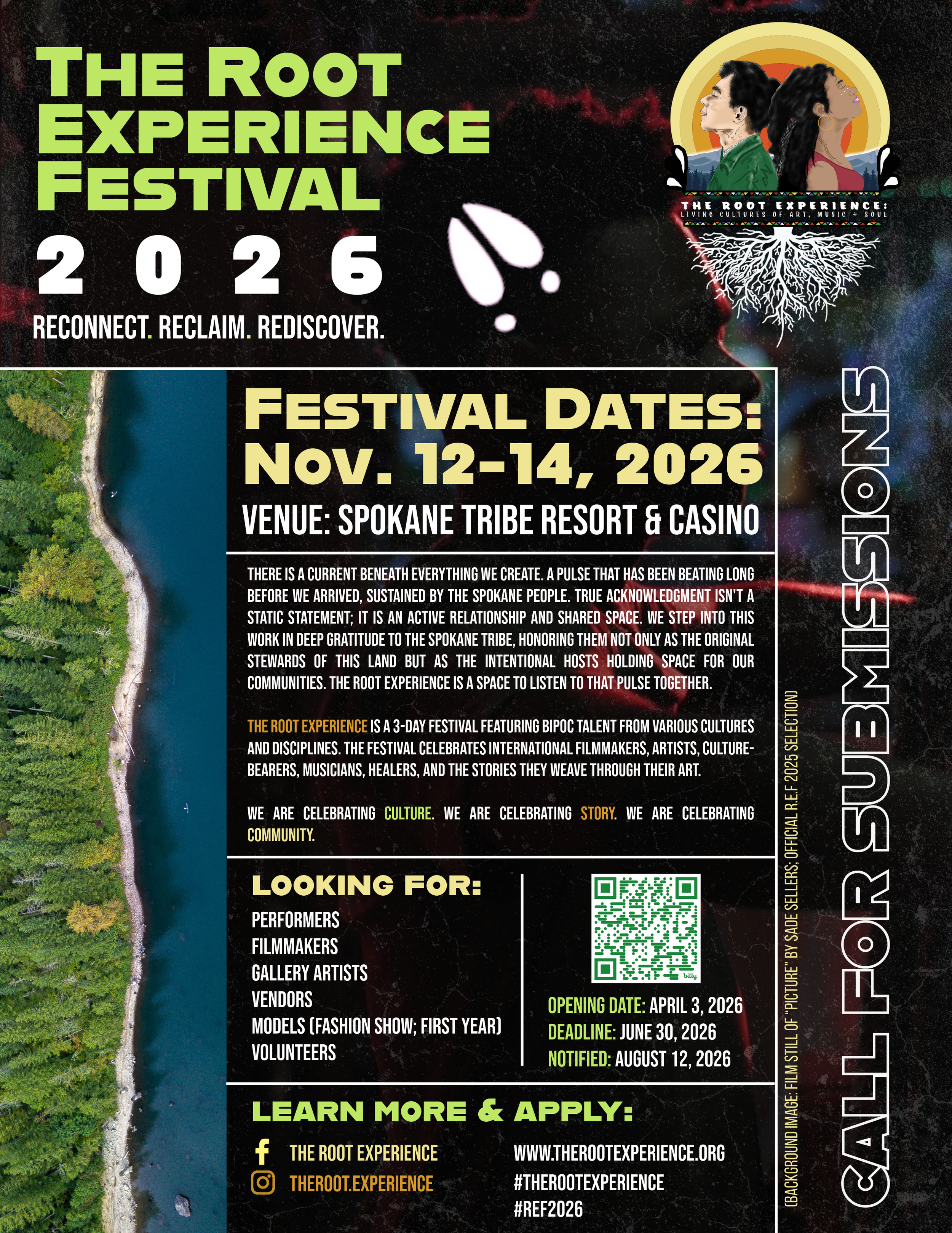 From November 12–14, 2026, we are gathering at Spokane Live at the Spokane Tribe Resort & Casino. Through a meaningful partnership with the Spokane Tribe Resort & Casino, we are holding three days for the regional filmmakers, visual artists, culture bearers, and musicians who carry the living stories of their communities.